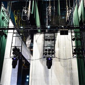 在燈架下沿,每側(cè)配若干套“日”字型燈光排架,用于懸掛燈具,燈光排架可手動使之在垂直臺口方向移動,燈架可整體升降。燈光排架可根據(jù)需要上下疊加。也有用雙層燈光吊桿桿體硬聯(lián)接組成的掛燈結(jié)構(gòu)。