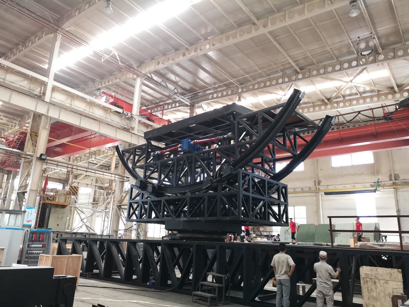 (3)海盜船動(dòng)作功能:大船的底部在長度方向?yàn)閳A弧面,船體可沿長度方向前后滑移,呈現(xiàn)在巨浪中前后擺動(dòng)的效果,且前后擺動(dòng)的幅度60°。