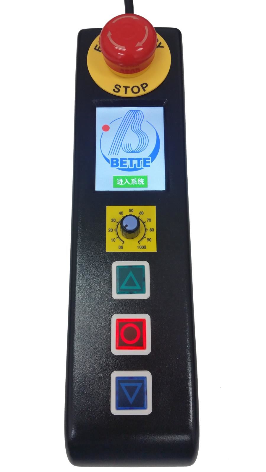 近控盒上裝有“緊急停止按鈕”,與主控制系統(tǒng)的急停鏈做串聯(lián)處理,在遇有無法正常停車的情況時,可以拍下此按鈕,切斷主控制系統(tǒng)的三相供電,待排除了意外情況之后再予以恢復。